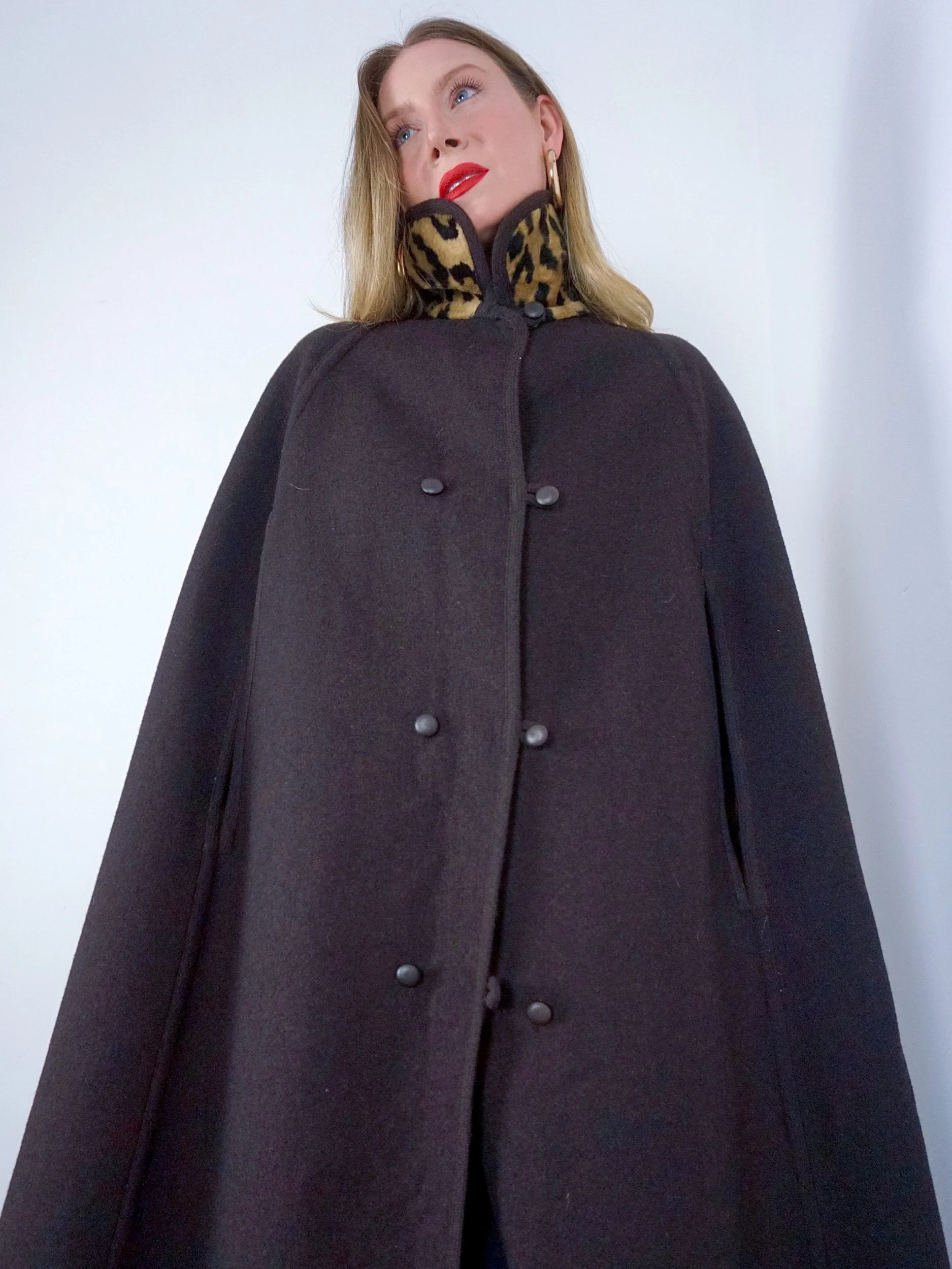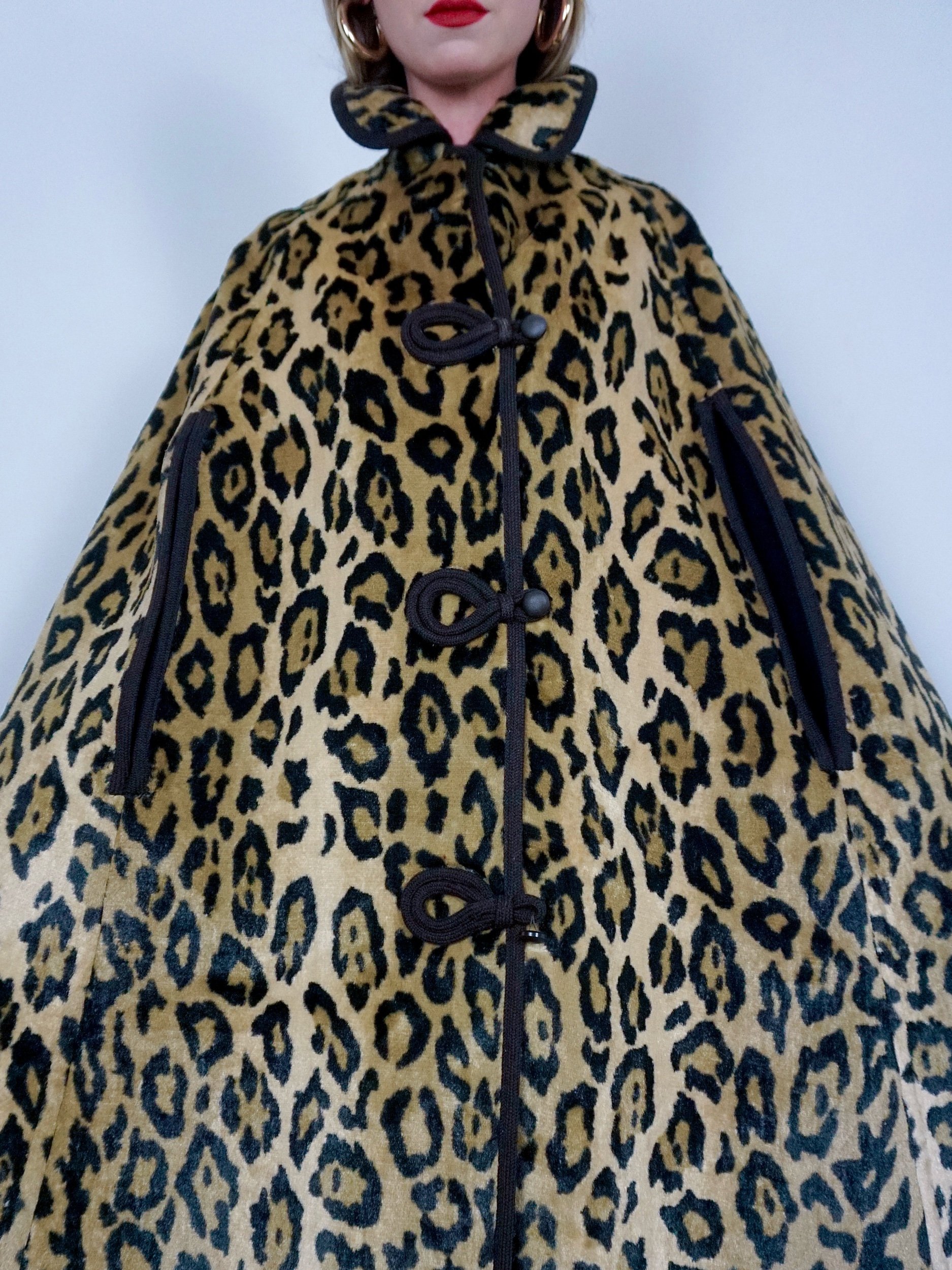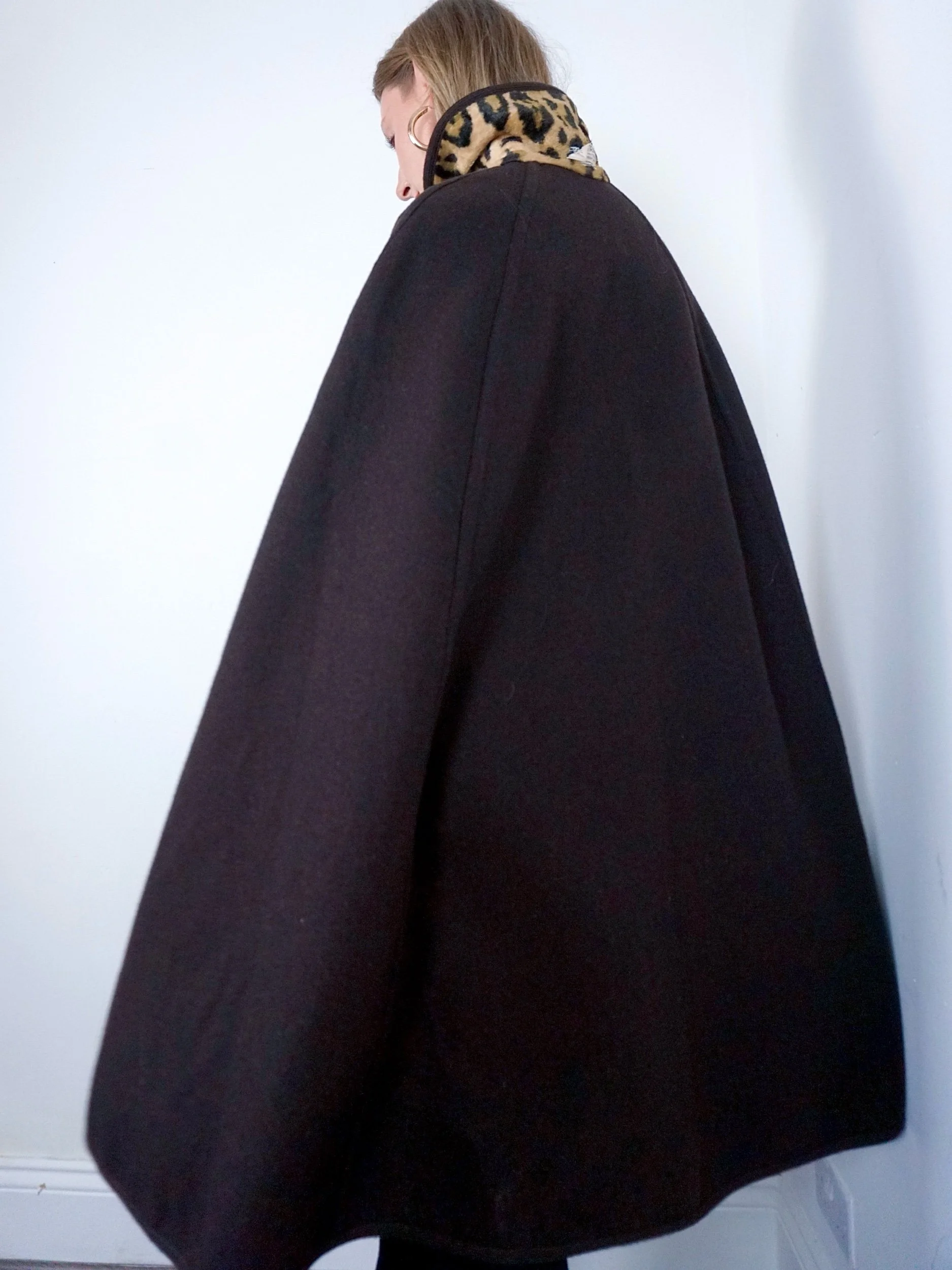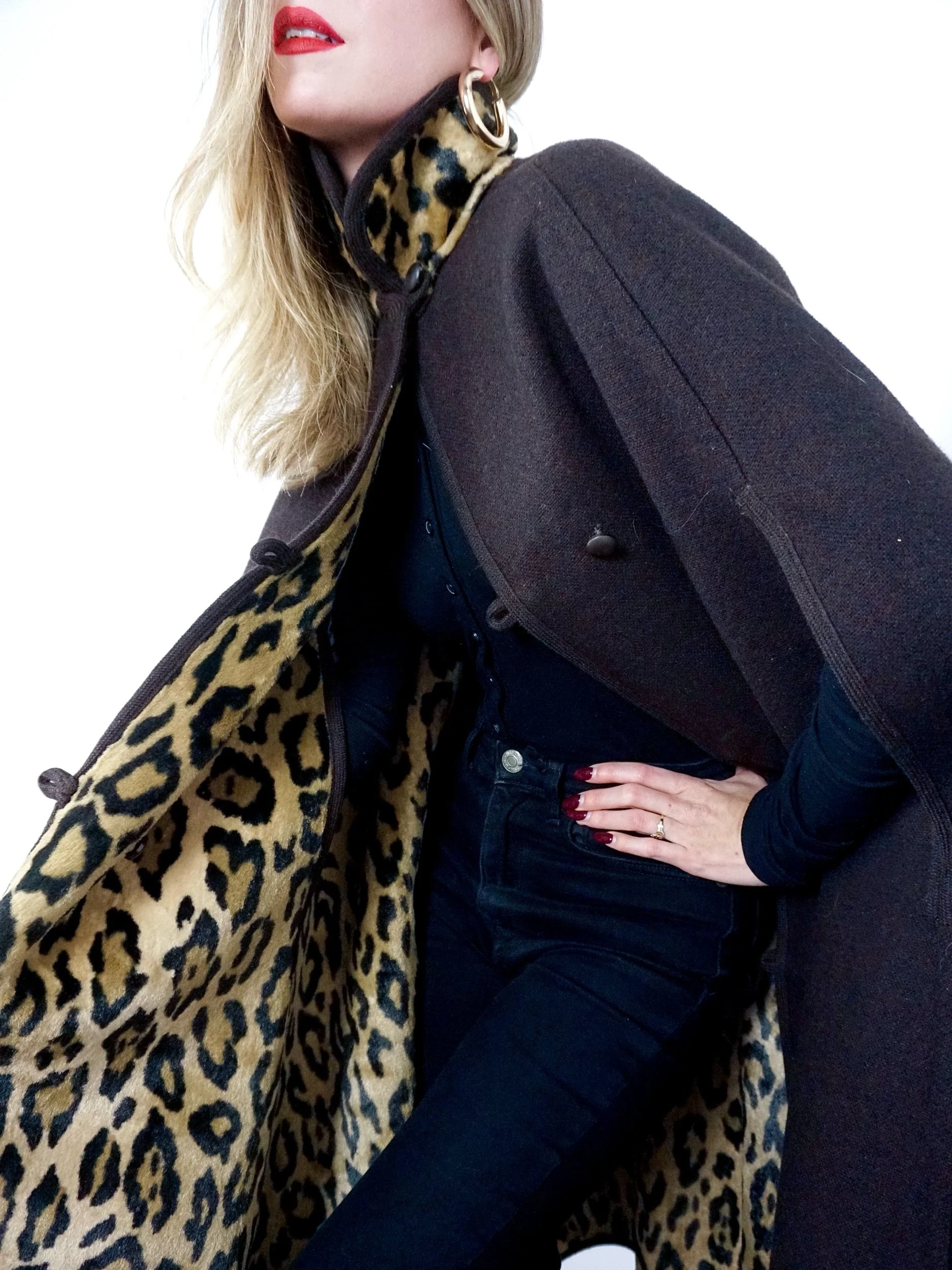 Chocolate brown wool that reverses to a fur like Leopard print with stunning button fastening detailing