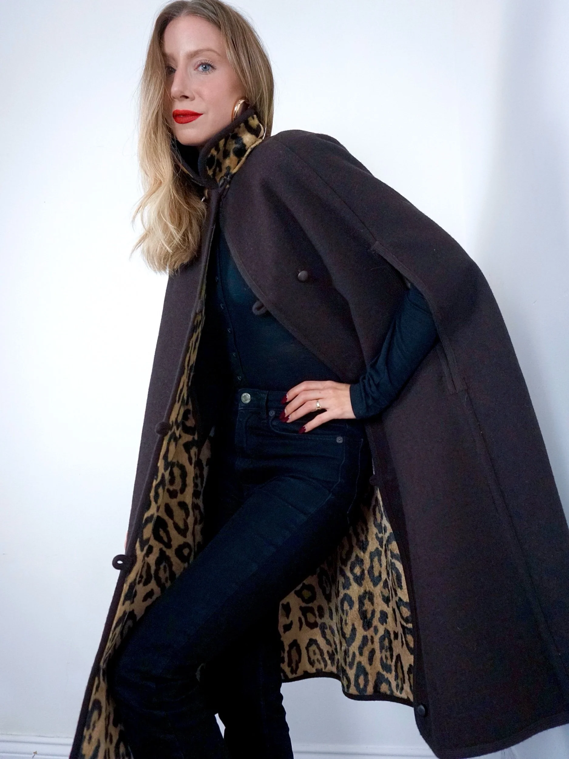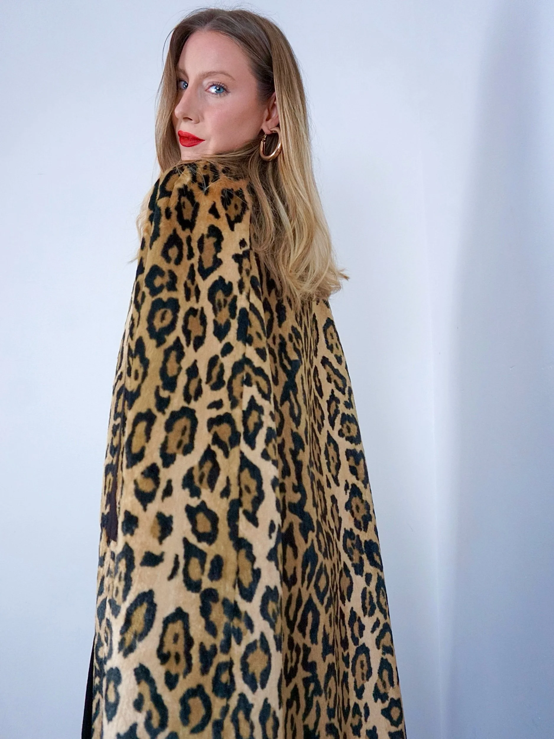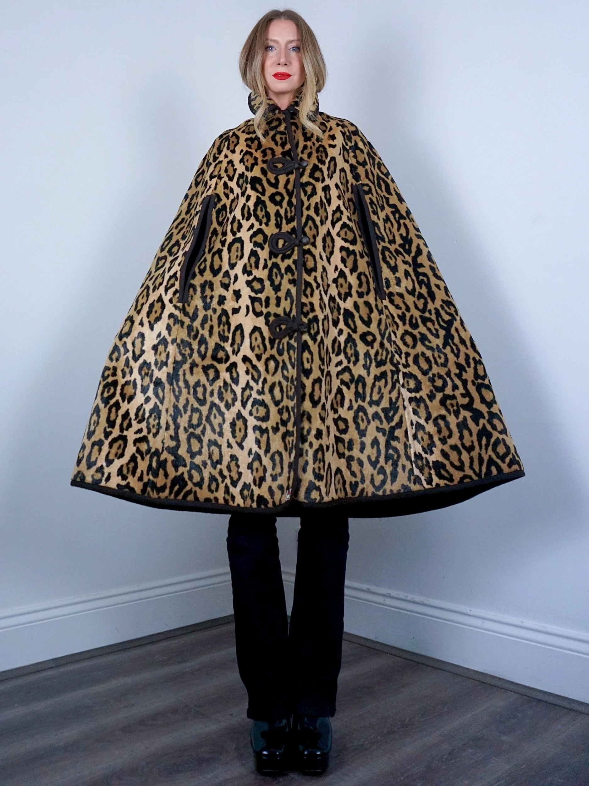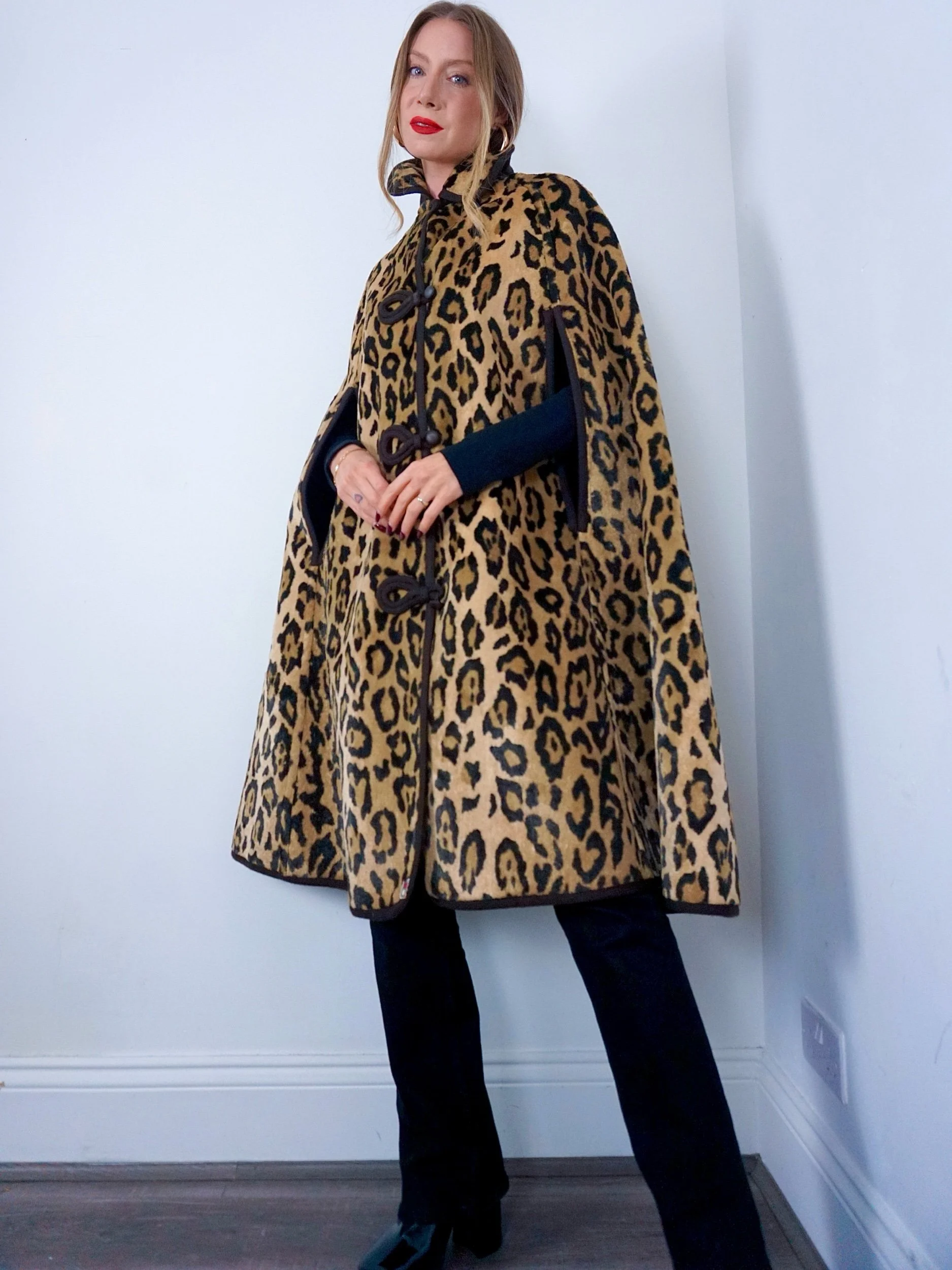 Chocolate brown wool that reverses to a fur like Leopard print with stunning button fastening detailing