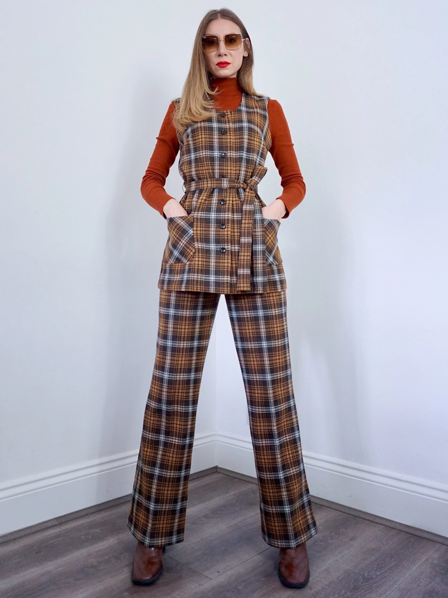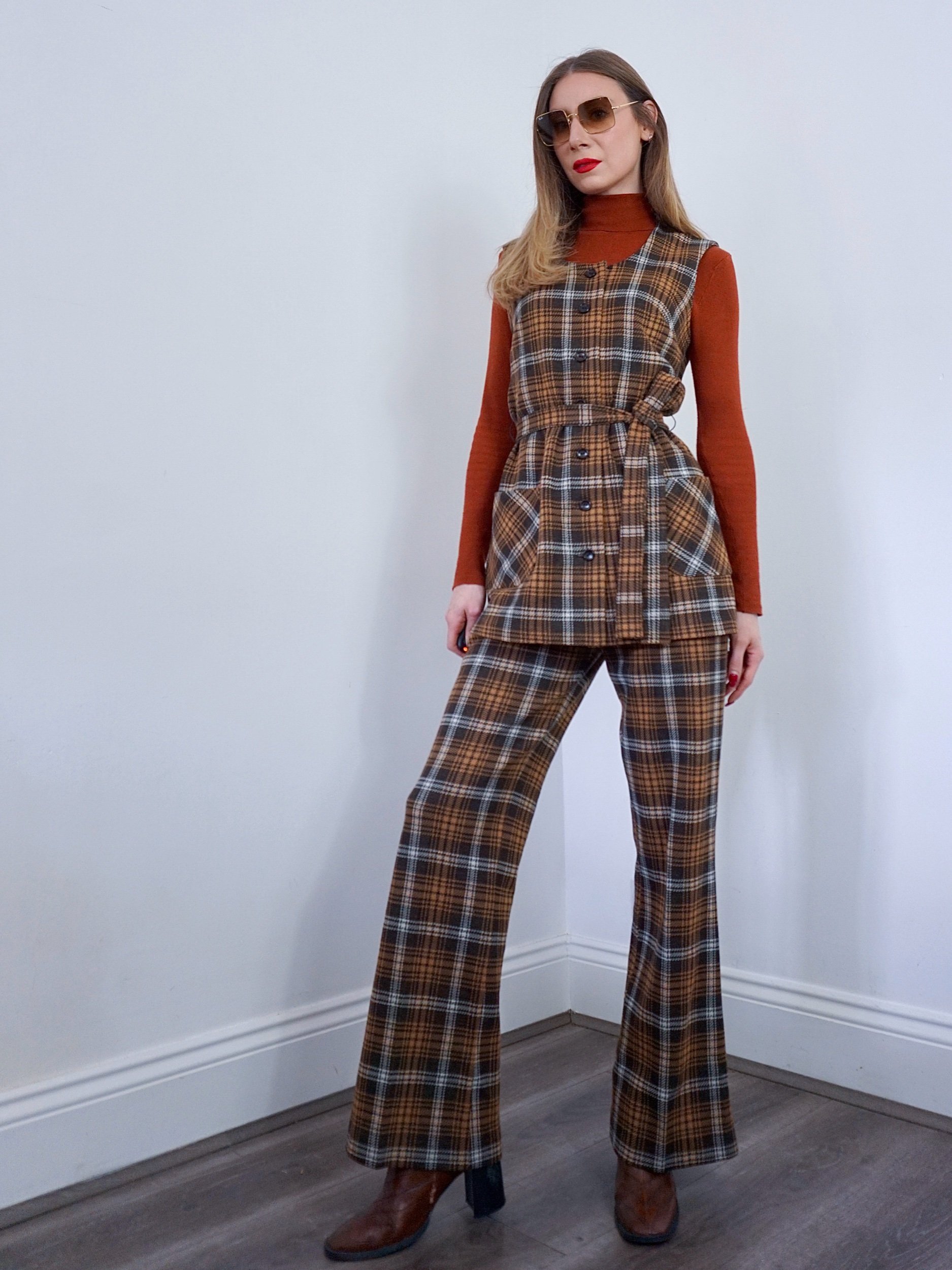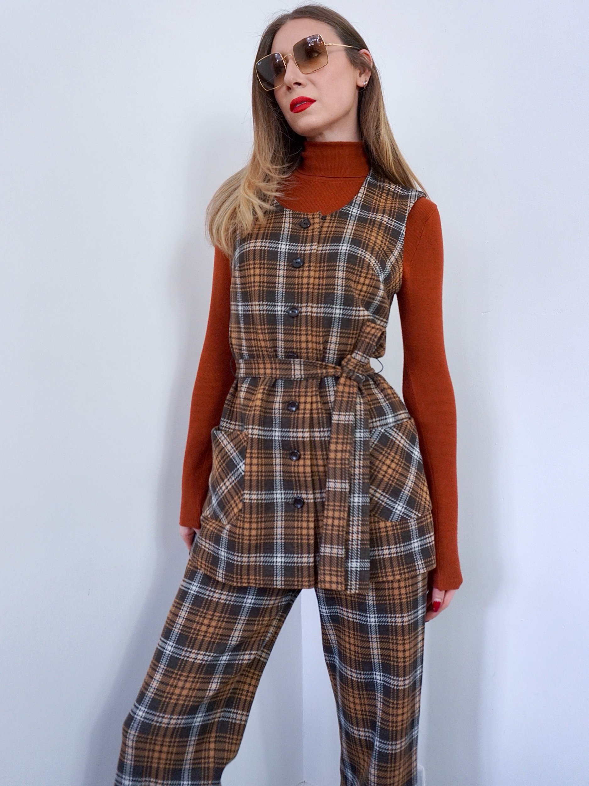 1970s two piece suit in a dark chocolate drown and rust check.