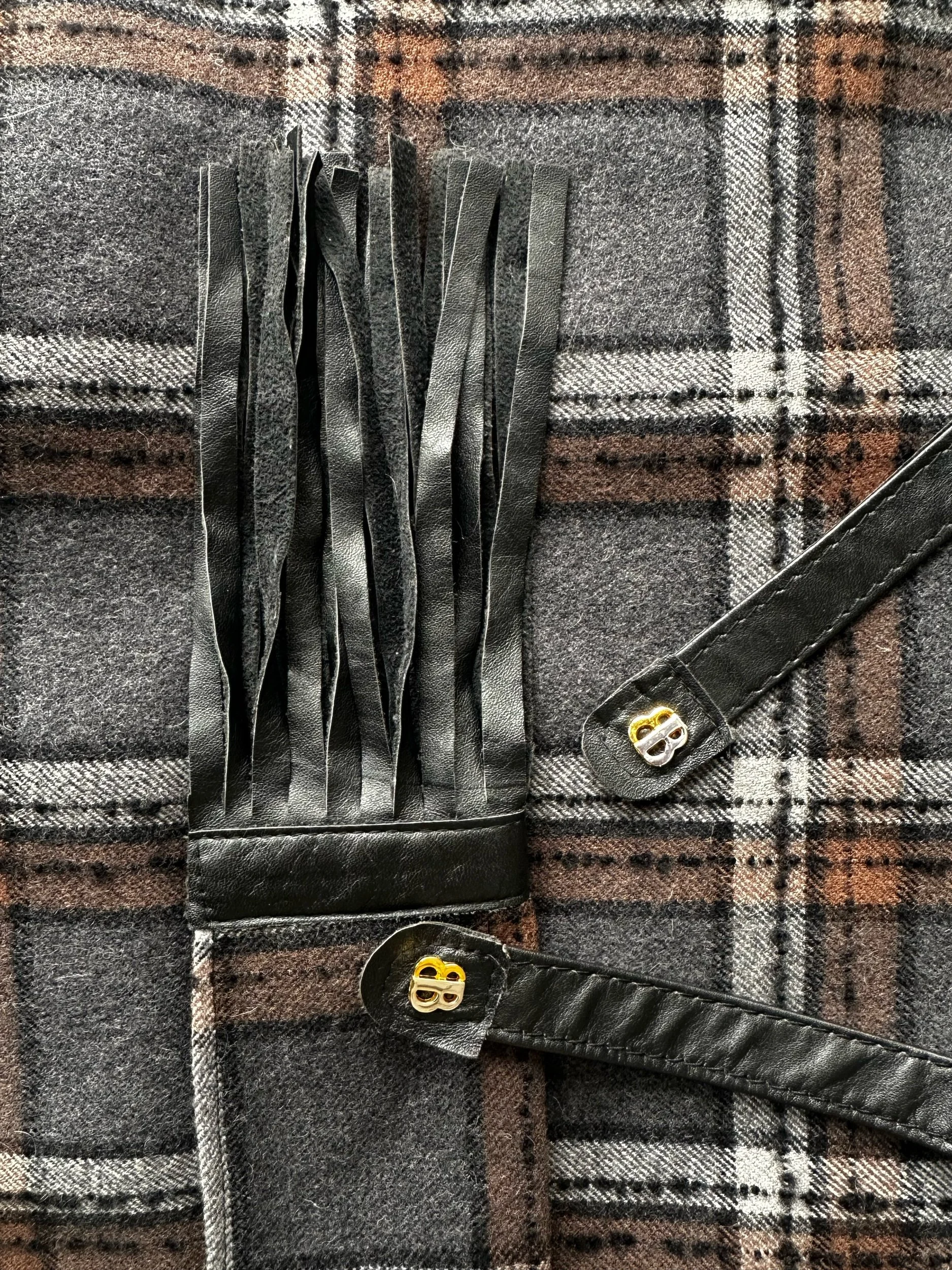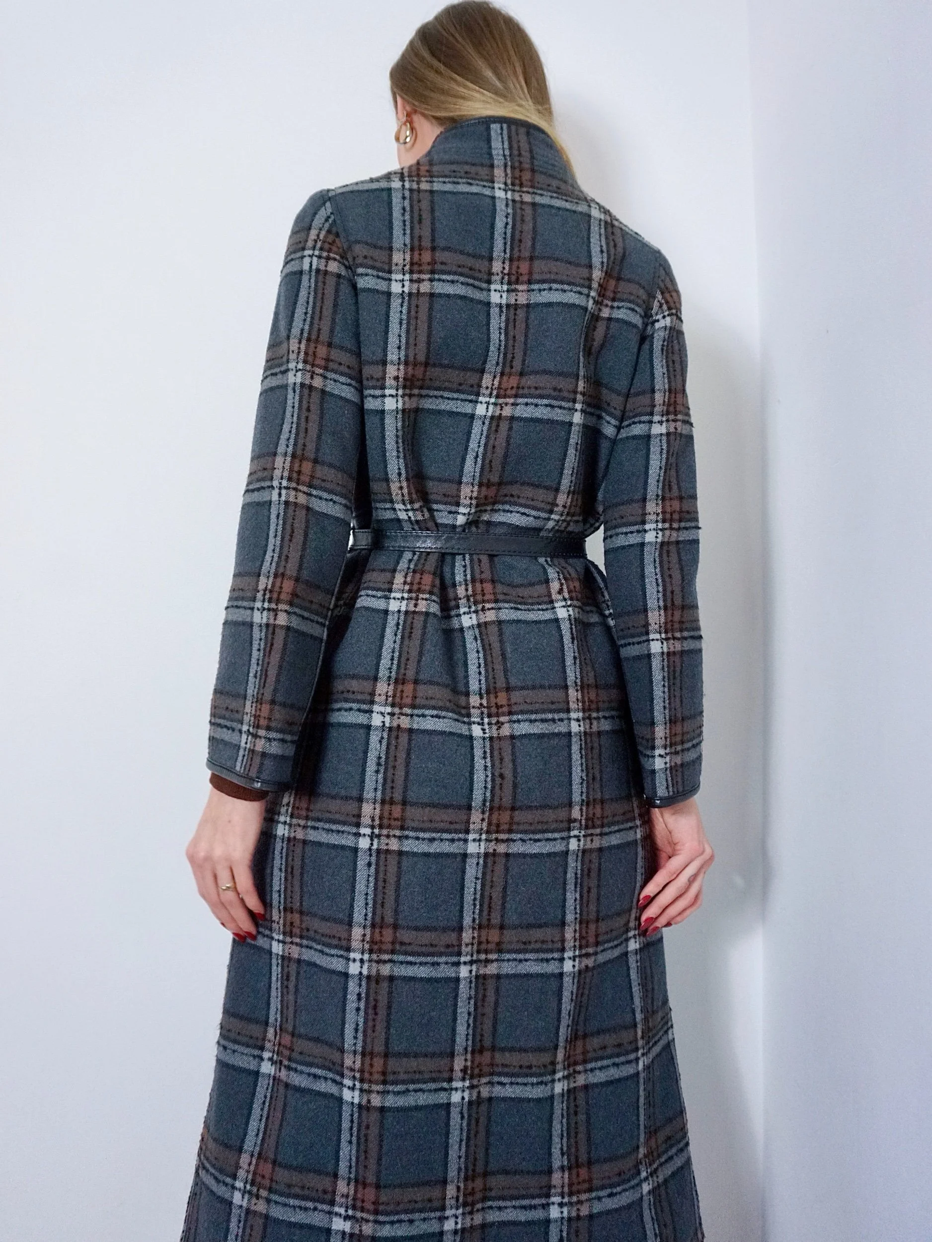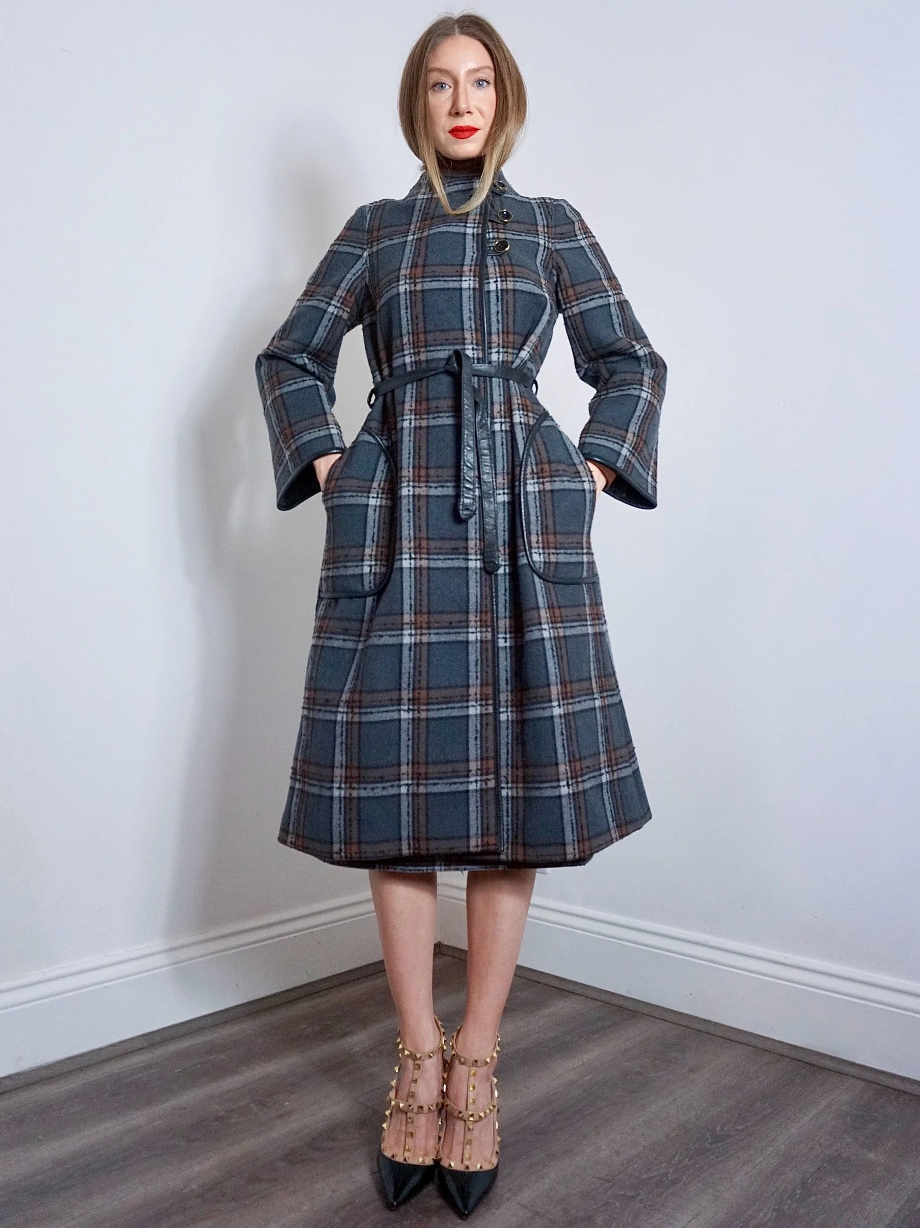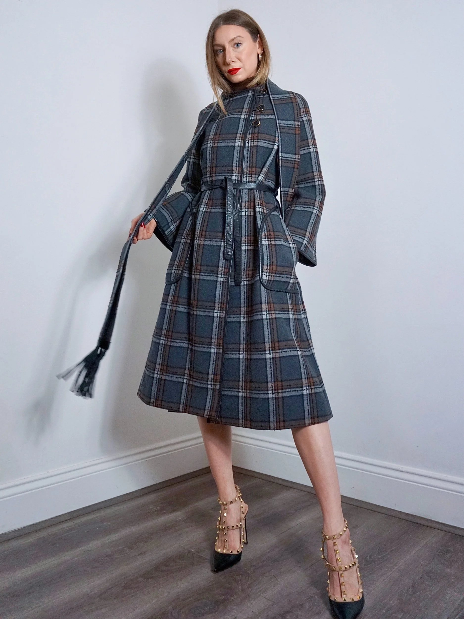 Consisting of a gorgeous grey and brown checked coat buttoning to one side, fastening with large black and gold buttons. She has a leather trim to her wide sleeves, large front pockets, and matching leather belt with gold and silver ‘B’ emblems to the end.