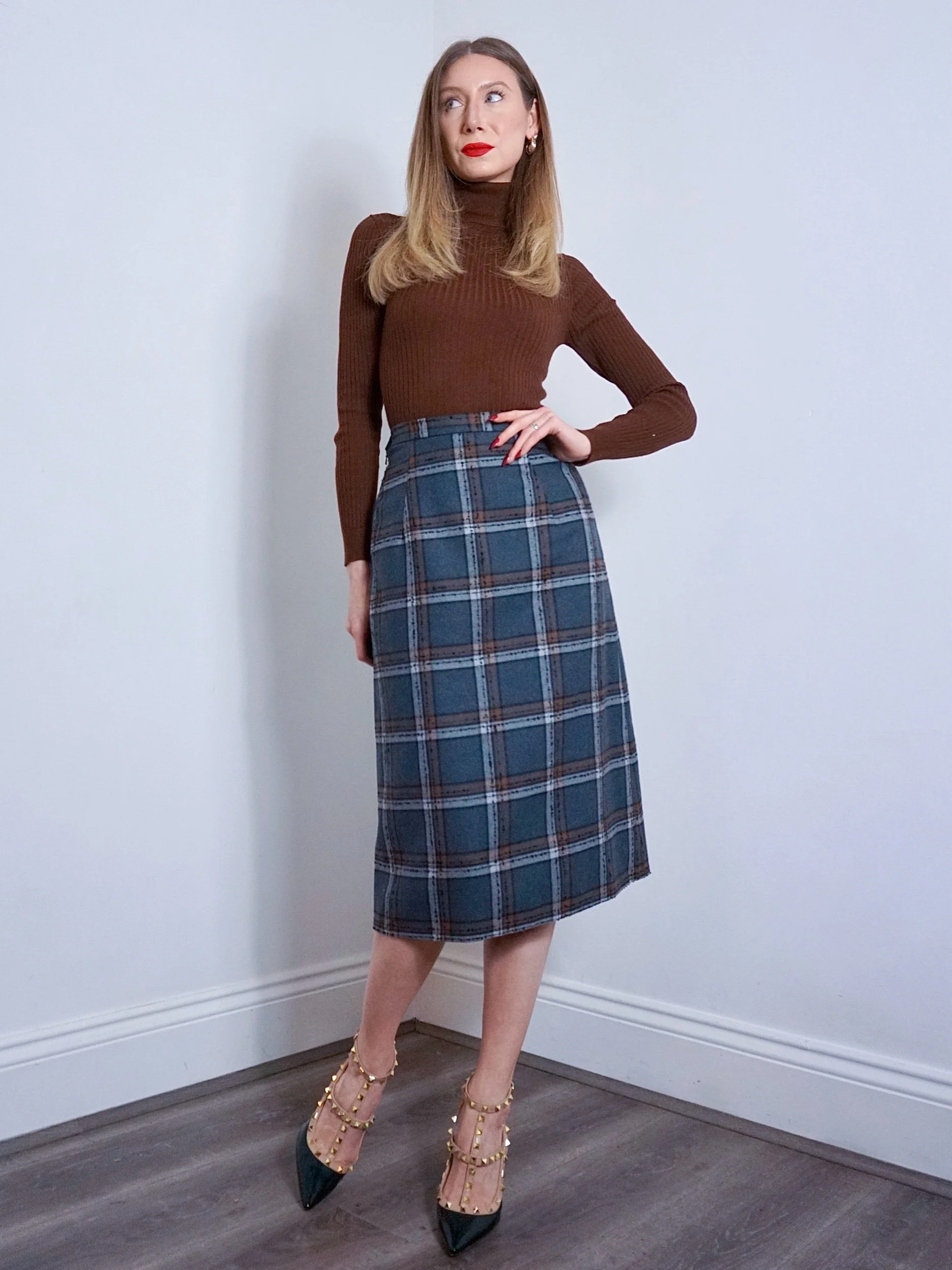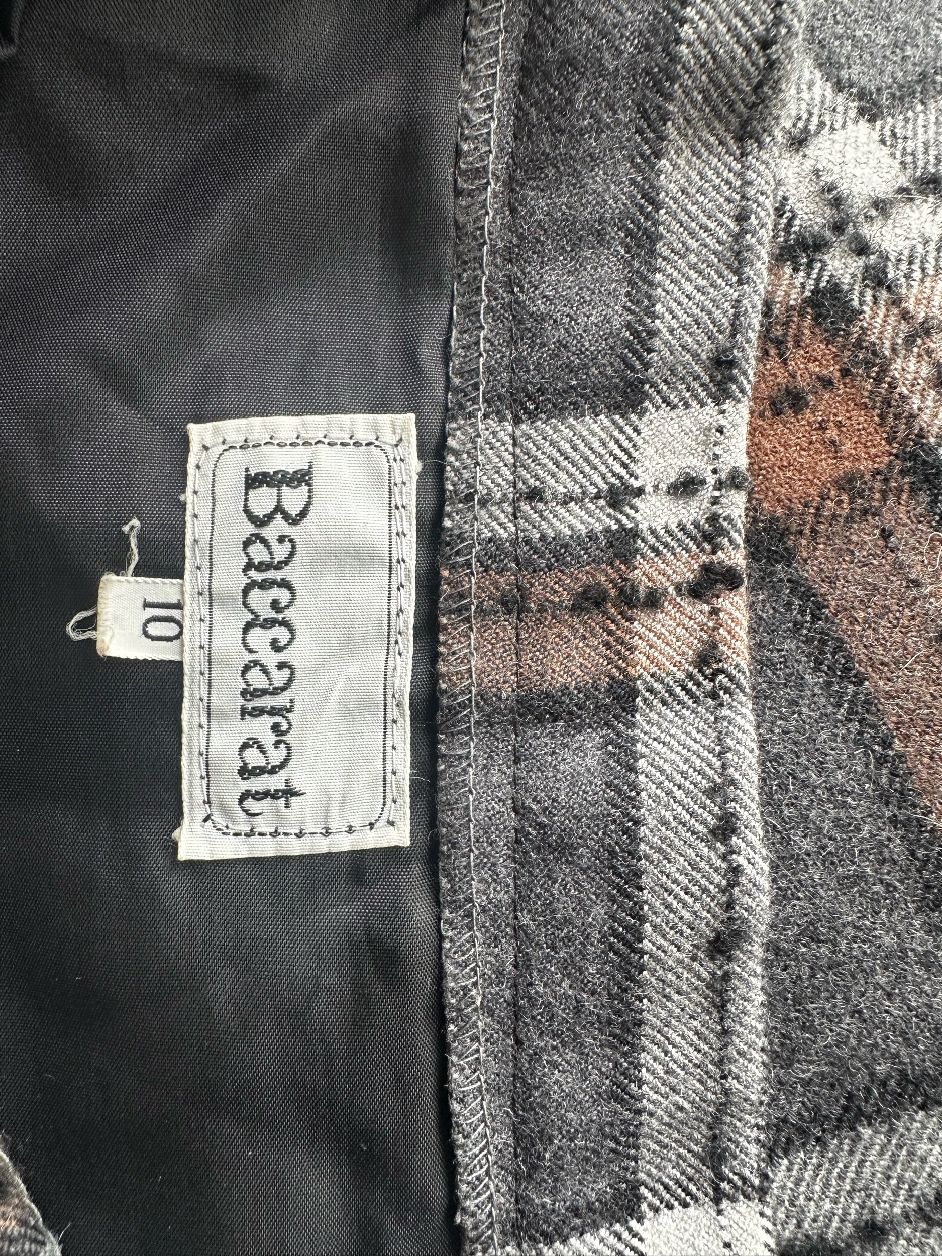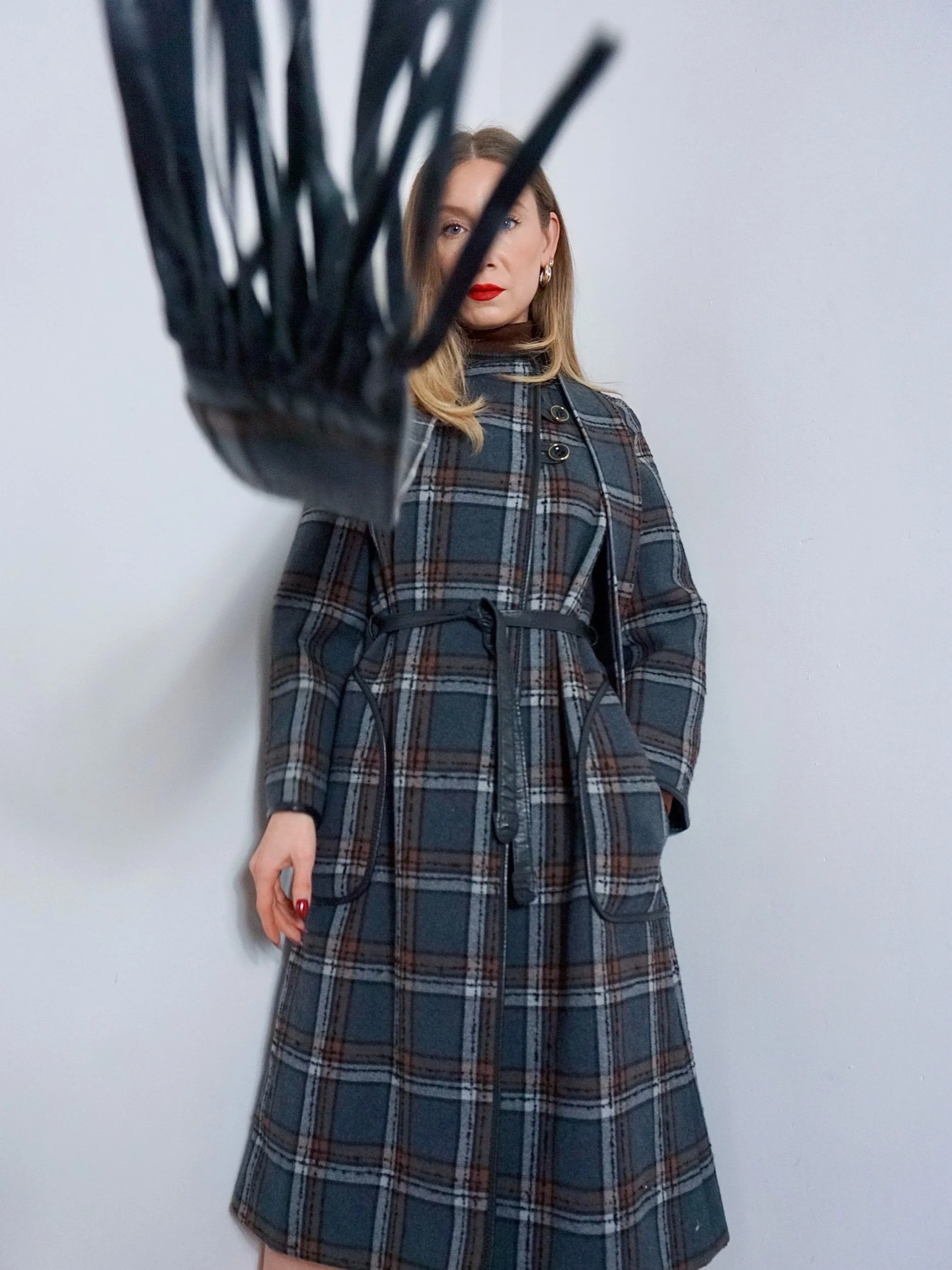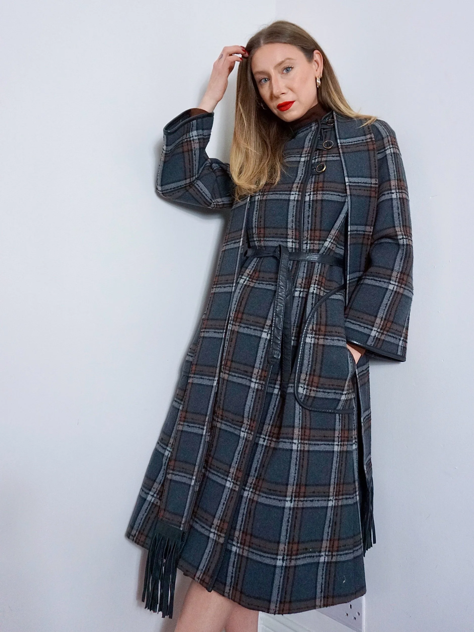 Consisting of a gorgeous grey and brown checked coat buttoning to one side, fastening with large black and gold buttons. She has a leather trim to her wide sleeves, large front pockets, and matching leather belt with gold and silver ‘B’ emblems to the end.