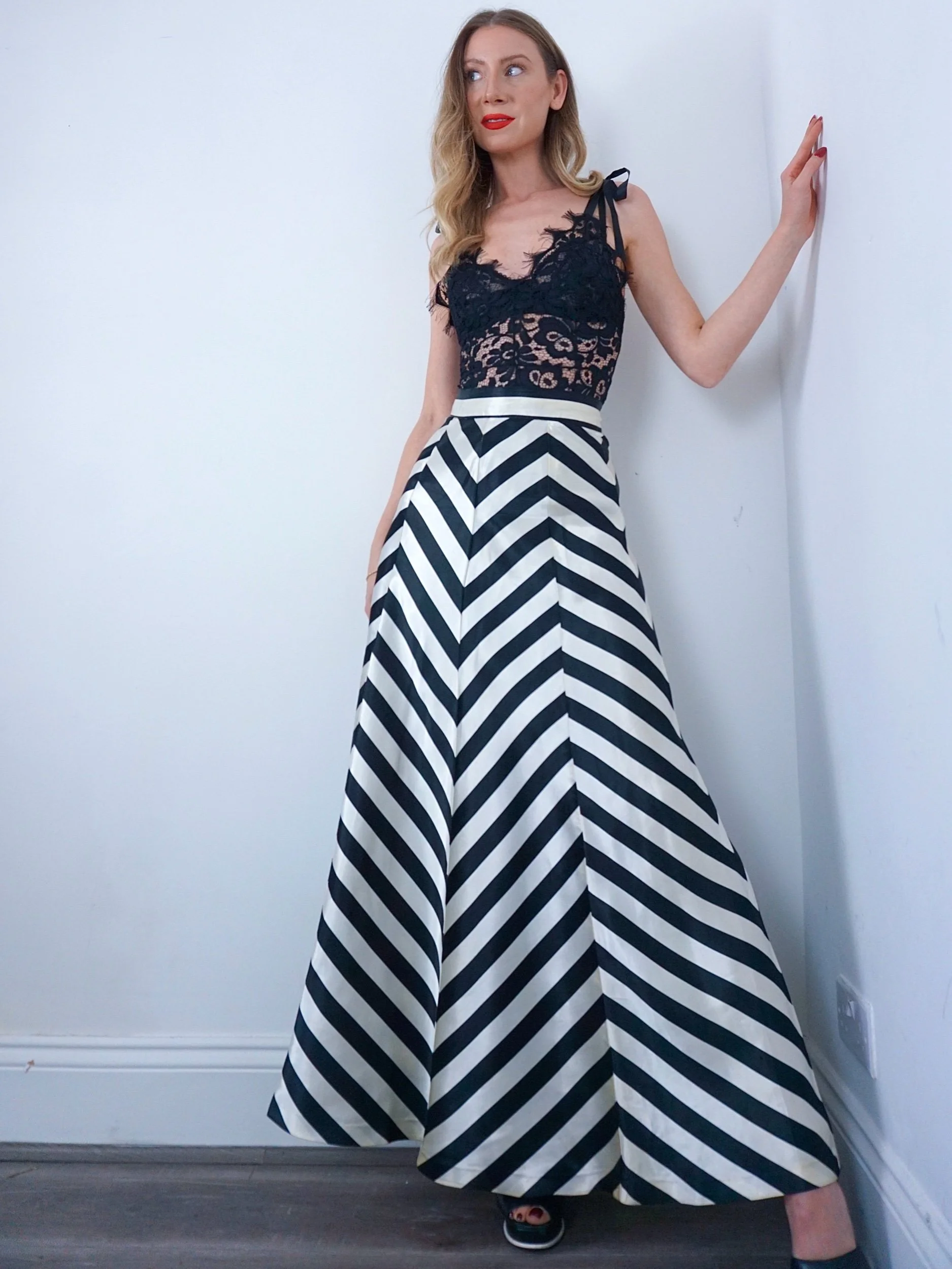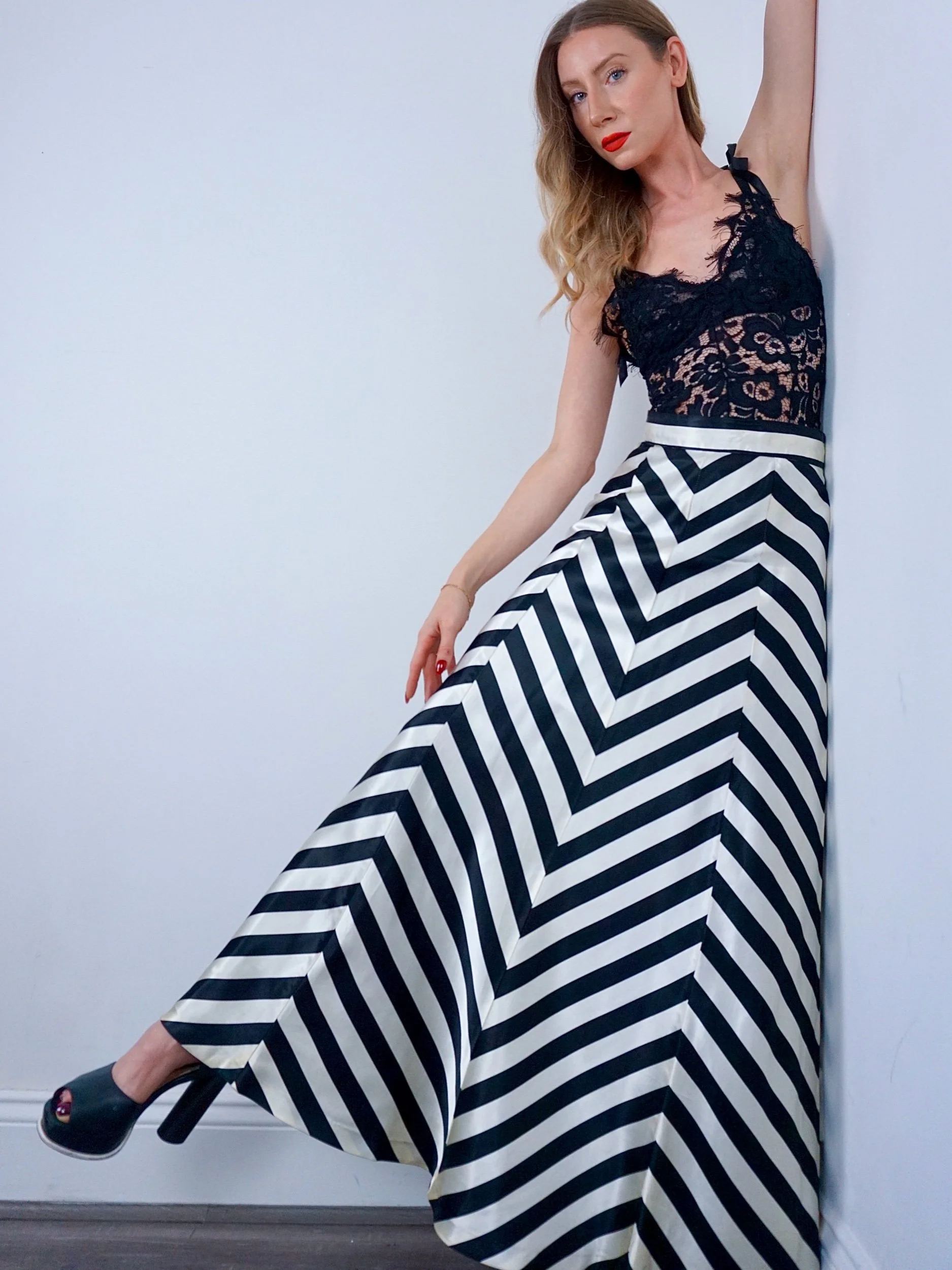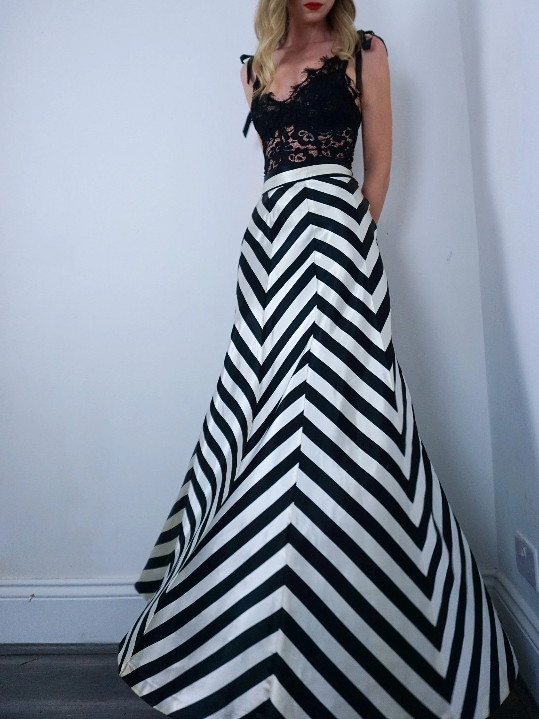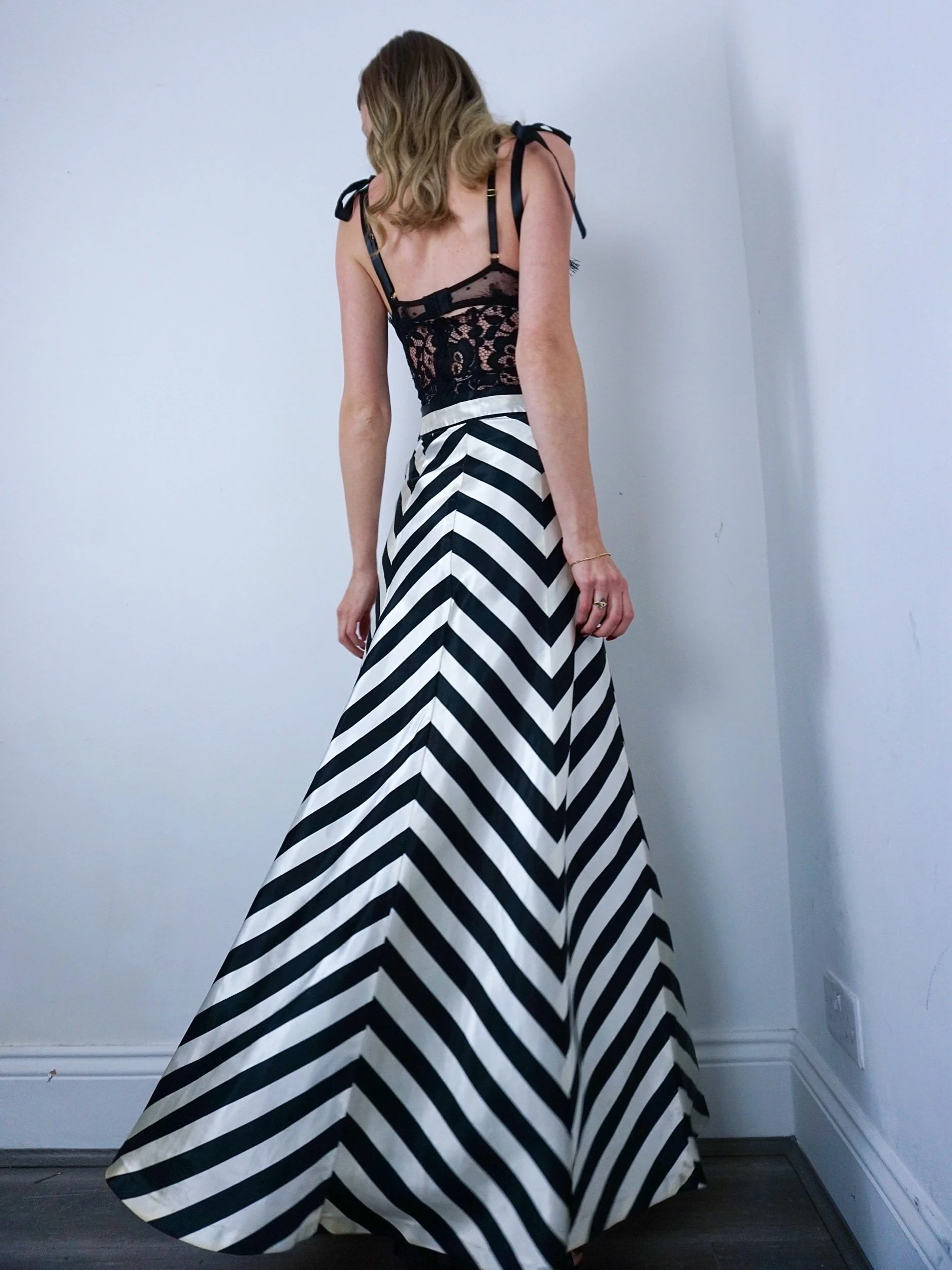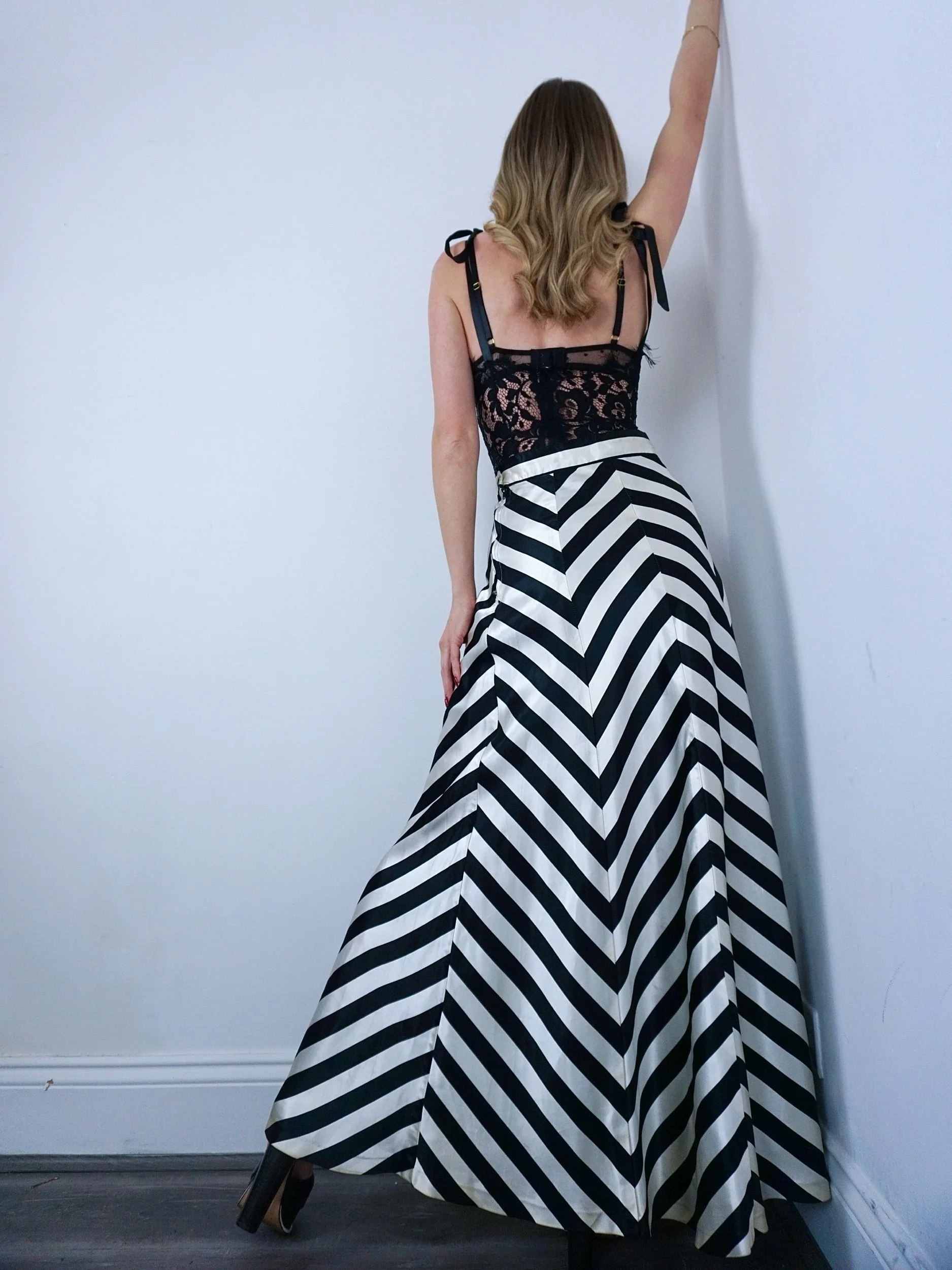 Truly elegant 1970s does 20s liquid satin maxi skirt. In a black and white chevron print creating an almost fishtail illusion. This piece is truly stunning and iconic design that screams elegance